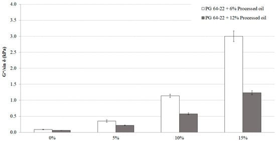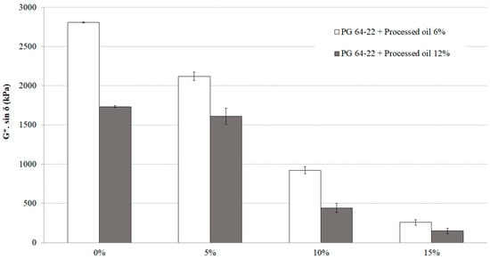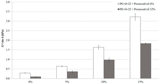 G*sin δ values of PG 64-22 binder modified with processed oil as a function of SIS content at 25 °C and long-term aging with RTFO + PAV.