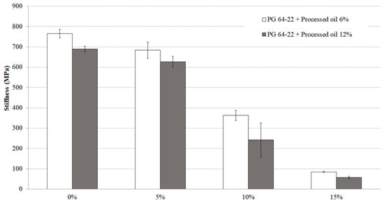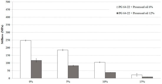 The influence of SIS and processed oil content on the stiffness values of modified asphalt binders containing 6% and 12% processed oil was examined at −24 °C. The results of the study demonstrate the notable impact of incorporating SIS and processed oil on the stiffness values. Specifically, for the asphalt binder modified with 6% processed oil, the stiffness values at 0%, 5%, 10%, and 15% SIS content were 765 MPa, 683 MPa, 363 MPa, and 84 MPa, respectively. Similarly, the stiffness values for the asphalt binder modified with 12% processed oil, with the same SIS contents, were determined to be 690 MPa, 627 MPa, 242 MPa, and 57 MPa, respectively. These findings indicate that the inclusion of SIS and processed oil in modified asphalt binders enhances their resistance to low-temperature cracking.
