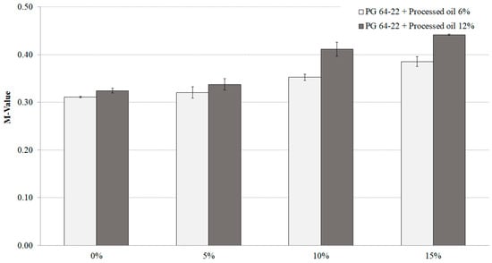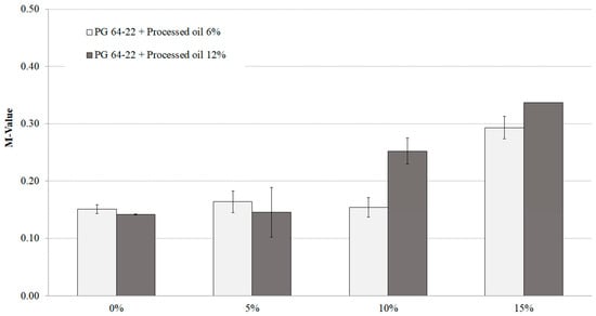 Impact of SIS content on m-values of long-term-aged PG 64-22 binders, modified with 6% processed oil and 12% processed oil, at the temperature of −12 °C.