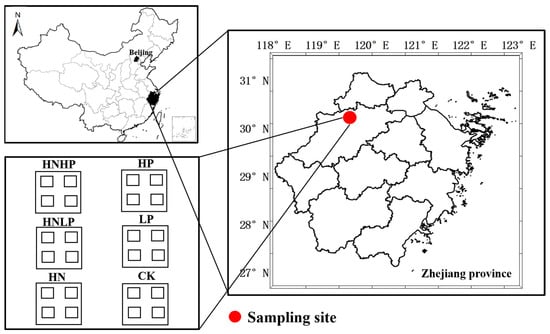 The study site is located at Wulitou forest station (119.67° E and 30.21° N), Lin’An District, Hangzhou City, Zhejiang Province, China (Figure 1) []. This site has a subtropical monsoon climate. The mean annual temperature and precipitation are 16.4 °C and 1613.9 mm, respectively. The altitude is 175 m, and the annual sunshine hours are 1847.3 h []. The study plots were 10 years old (mid-rotation age) and planted with pure Chinese fir forests. The detailed study site conditions, stand characteristics, and plot soil physical and chemical properties have been presented in detail in our previous study []. Our previous study [] also proved that this study site is an N-rich and P-limited ecosystem.