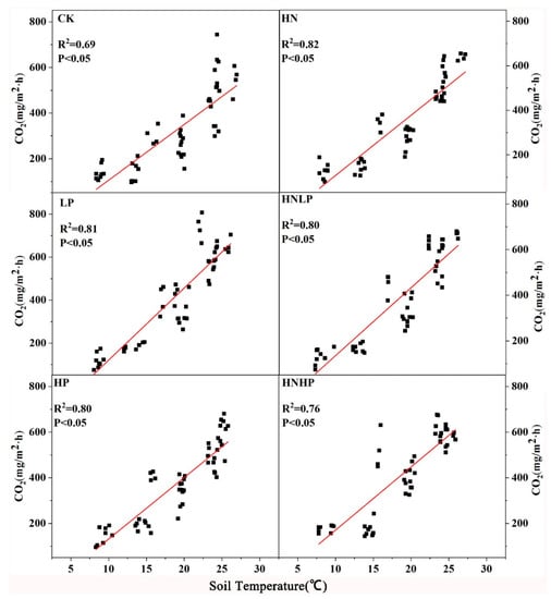 Correlations between soil temperature (°C) and CO2 flux (mg/m2/h) under different treatments. R2 is the coefficient of determination, p is the significance level for the slope of the fitted line, with p < 0.05 denoting a significant correlation.