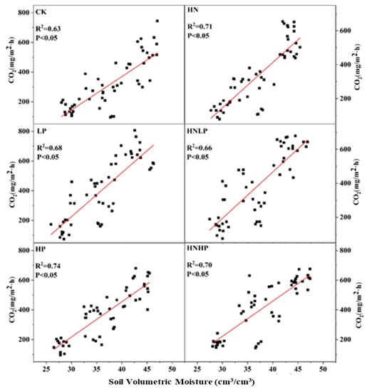 N and P additions and other climatic factors could interactively affect the change in soil CO2 efflux. The correlation analyses indicated a significant positive correlation between soil temperature and CO2 efflux under all treatments, showing an increasing trend with increasing soil temperature (Figure 2). Soil temperature explained 76–82% of the variations in soil CO2 emissions, among which the HN treatment had the highest correlation, and the HNHP treatment had the lowest interpretation rate. However, all treatments had higher correlation coefficients than the control (69%), indicating that N and P addition increased the sensitivity of soil CO2 emission to soil temperature. Soil CO2 emissions showed a significant positive correlation with soil moisture under the control and all treatment plots (Figure 3). The interpretation rates of soil moisture ranged from 63% to 74%, with the highest interpretation rate in the HP treatment and the lowest in the HNLP treatment, but all treatments were higher than the control.