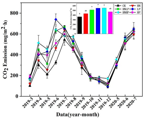 Monthly dynamics of soil CO2 emission (mg/(m2·h)) under different treatments. Error bars denote standard deviation (n = 4). The inserted small bar graph on the top depicts the mean emission rate of CO2 in the first four months (from April to July 2019). Each bar represents mean value of all four months under each treatment. The different letters above bars indicate significant differences among months, and the bar colors denote different treatments.