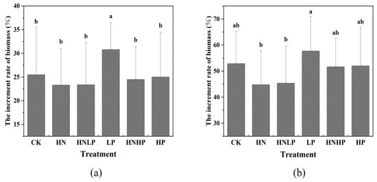 We further analyzed the effects of N and P addition on the tree productivity represented by the changes in biomass. After the growing season of the experiments, the biomass of the Chinese fir forest under all treatments increased (Figure 6a). Under the control (CK), the biomass increment rate was 25.5%, while increment rates under LP, HP, HNLP, and HNHP were 31%, 25%, 23%, and 24%, respectively. Among these, the increment rate under LP treatment was significantly higher than those of under other treatments and the CK, while the increment rates under other treatments were not significantly different from the CK. After three growing seasons (Figure 6b), under the control (CK), the biomass increment rate was 53%, while the increment rates under HN, LP, HP, HNLP, and HNHP were 45%, 58%, 52%, 45%, and 52%, respectively. The increment rate under LP was still greater than the CK, but the difference was no longer significant, indicating an abating effect of LP on tree growth after the end of LP addition. By comparing the shorter and longer effects (Figure 6a,b), we found that LP treatment can exert a long-term promoting effect on the biomass increment due to legacy effects. This suggests that only a lower P addition level can maintain tree N and P nutrient balances in the N-saturated Chinese fir plantation of the study region. Either high P-alone or high N addition could suppress tree growth by causing the imbalance between N and P availability.