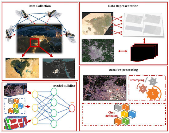 Furthermore, this paper introduces a new dataset for identifying land use and land cover in Fayoum state, Egypt. This state is used as a case study because it has a variety of land use and land cover examples; additional information regarding the geographic location being studied is provided within the “Study Area” Section 3.1. Satellite images are obtained using the 4-band planet scope of 1 June 2022, with each image having 4 bands (red, green, blue, and near-infrared). The ground sample distance for these images is  3.7  m and their pixel dimensions are  7939 × 3775 . These images undergo a series of procedures before being utilized as input for the proposed model. Figure 1 illustrates the sequential processes and phases utilized for constructing the model, beginning with data collection from satellite imagery. It then proceeds to data representation, followed by pre-processing to enhance the input images and establish various classes, such as numbers 1, 2, and 3, to represent different categories. Finally, the model building phase is conducted to construct the model using the training data.