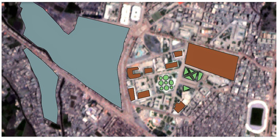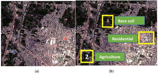 The initial step involved collecting and representing the data, following which a mosaic image was produced from input images that contained multiple bands of data. They are high-resolution images with 4 bands (RGB and near-infrared) generated by re-sampling input images using the k-nearest neighbor  K N N  approach. In Figure 5a, a mosaic image is generated and then the characteristics of various objects within it are identified and used to classify them according to their shape, color, type, and the land cover they appear on. The resulting data are divided into eight distinct categories, each with detailed descriptions of their sub-categories as listed in Table 1. In this current stage, a fresh set of categories is introduced and a training dataset is generated. The process involves digitizing the detected objects for each class and saving them as a separate category in the vector layer. Subsequently, each category within the training dataset is assigned a distinctive number. As depicted in Figure 5b the numbers 1, 2, and 3 represent three specific types from the defined classes: residential, agriculture, and bare soil. These numbers are used to symbolize different categories, while the shapes depict the corresponding digitized area associated with each type. Finally, a distinct color is assigned to each category, as illustrated in Table 1.