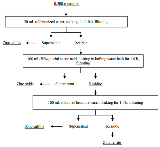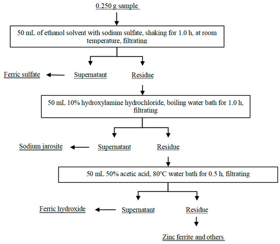 During the analysis, one main phase was dissolved in a pre-prepared specific solvent. The leaching solution was filtered with a vacuum filter after being dissolved completely and the filter residue was used for the analysis of another phase in the next stage. Meanwhile, the content of supernatant was analyzed by AAS. The processes of the chemical phase analysis of iron, lead, zinc and copper are shown in Figure 2, Figure 3, Figure 4 and Figure 5 [29], respectively.