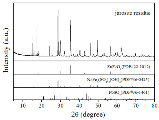 The elemental composition of the jarosite residue sample was analyzed by XRF and the chemical analysis results are given in Table 2 and Table 3, respectively. The data from the ICP-AES are similar to those from the XRF. The main elements in the jarosite residue were Fe, O, S, Zn, Pb and Na, which accounted for more than 95% of the total mass of the jarosite residue. In addition, the jarosite residue also contained a small amount of Mn, Cu, As, Sn, Cd, Ag, etc., among which Zn, As, Pb, Cu, Cd are toxic and harmful elements and should not be released into the environment.