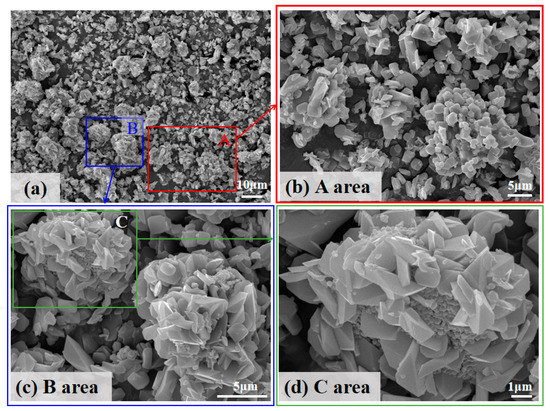 SEM images of jarosite residue. (a) Mag. 1000×; (b) Area A, Mag. 3000×; (c) Area B, Mag. 5000×; (d) Area C, Mag. 10,000×.