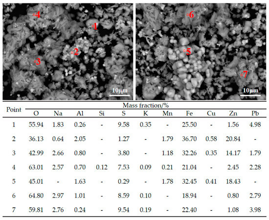 Microstructural analysis of the jarosite residue was carried out by using a scanning electron microscope (SEM), and the results are shown in Figure 7 and Figure 8. Based on these microphotographs and EDS, it can be seen that the phase composition and the particle size of jarosite residue are not homogeneous. Figure 7 shows that there are two kinds of morphology for the jarosite residue: one is rhombohedral, octahedral or a flake with a grain size of 1 μm~5 μm, which is consistent with Ref. [24]; the other comprises smooth ellipsoid or irregular small particles with a particle size of 0.1 μm~5 μm, which is mainly attached to the surface of rhombic large particles. It can be seen that the rhombohedral crystals grow in overlapping agglomeration, and the smooth ellipsoidal small particles are wrapped or sandwiched on the surface in region B. Figure 8 shows a typical phase distribution of jarosite. The two types of jarosite slag morphology exhibit distinct colors. The rhombohedral crystals appear dark, while the ellipsoidal particles exhibit a bright white coloration. The bright white points, identified as points 2 and 5, share a similar composition primarily composed of O, Fe, and Zn. This composition strongly suggests that these bright white points could be zinc ferrite. Importantly, it is worth noting that zinc ferrite does not contain lead, as indicated by its composition.On the other hand, the dark spots identified as points 1, 4, 6, and 7 exhibit similar compositions. They primarily consist of O, S, Fe, Na, and Pb. This composition strongly suggests that these dark spots are likely composed of jarosite.