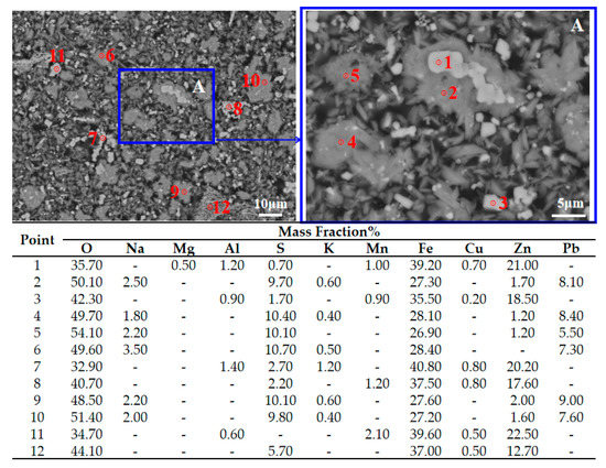 The analysis results of the chemical phase composition of iron, lead, zinc and copper in the jarosite residue are shown in Table 4, Table 5, Table 6 and Table 7 respectively. It is seen from Table 3 that 71.82% of iron exists in the form of sodium jarosite, while the zinc ferrite phase and others account for 23.77%. The analysis results in Table 4 show that 77.22% of lead exists in the form of lead jarosite and 17.79% in the form of lead sulfate phase, while 2.56% and 2.42% exist in the form of lead oxide and lead sulfide, respectively. The lead in the chemical phase analysis results is different from that of the XRD, mainly because the occurrence state of lead is complex, and XRD cannot accurately identify a low-grade lead phase. Based on the results of both analyses, it is found that lead mainly exists in the form of lead jarosite and lead sulfate. According to the analysis results in Table 5, 81.31% of zinc exists in the form of zinc ferrite, while 16.83%, 0.37% and 1.49% exist in the form of the zinc oxide phase, zinc sulfate and zinc sulfide, respectively. Table 5 shows that up to 96.00% of copper exists as a bound copper oxide phase, while only 4.00% exists in the other phases, including free copper oxide, secondary copper sulfide and primary copper sulfide.