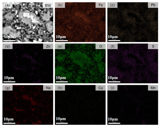 A comprehensive analysis of the spatial distribution of the key elements in the jarosite residue was performed using secondary electron scanning and X-ray mapping techniques. The result, depicted in Figure 10, indicates that the distribution regions of the Fe, O, Zn and Na elements partly overlap with each other, and Fe distribution is highly concentrated in the regions where the O, Zn, and O, Na elements are present, which may indicate that Fe is mainly present in the form of zinc ferrite or jarosite. The distribution regions of the Pb, S, O and Na elements overlap, and Pb is mainly distributed in the S, O and Na, O elements, which indicates that Pb may mainly exist in the form of lead sulfate and lead jarosite. In addition, copper and manganese are dispersed at a low concentration.