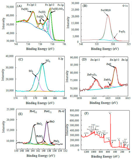 XPS spectra of jarosite residue. (A) Fe2p; (B) O1s; (C) S2p; (D) Zn2p; (E) Pb4f; (F) full spectrum.