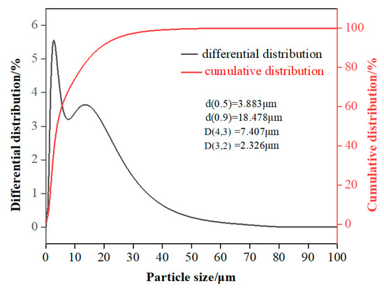 Figure 13 shows the particle size distribution within the range from 0 to 100 μm. The size of the jarosite residue particles is distributed in two concentrated areas of approximately 2.73 and 13.76 μm. It is shown that most particles are small, with size d (0.5) of 3.883 μm and d (0.9) of 18.478 μm, which it is difficult to process using mineral processing, and which must be treated by metallurgical processing. In addition, the volume average particle size D (4,3) of 7.407 μm and the surface area average particle size D (3,2) of 2.326 μm indicate that the particles of the jarosite residue are very fine, and can be processed without additional grinding.
