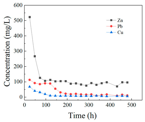 Long-term stacking of jarosite residue in the environment may pose environmental pollution risks due to heavy metal redissolution. Therefore, the results of the long-term leaching experiment (LTLE) are shown in Figure 14, which demonstrates that the initial stages of leaching revealed elevated levels of Zn, Cu and Pb, particularly for Zn, which can be attributed to the leaching of zinc oxide and zinc sulfate. Over the course of continuous leaching, the Zn concentrations rapidly decreased within 72 h, while the concentration of Zn in the leaching solution remained relatively stable after 72 h. However, the jarosite residue exhibited a residual Pb concentration (>5 mg/L) after the leaching test, suggesting that it may have the potential to continually pollute the environment.