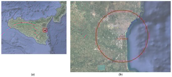 Location of the airport of Catania in Sicily (Italy) (a) and the buffer zone extending 13 km from the airport ARP (b).