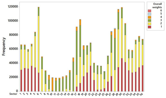 The computation of weights within sectors at angular steps of 10 degrees on the heatmap (Figure 4) made it possible to detect the most critical areas due to the presence of attractive surfaces. The frequency of the points with different weights for each 10-degree sector is quantified in Figure 5. The overall frequency for each sector is the total number of points related to the attractive surfaces. Based on the results of one-way ANOVA (p < 0.001), the average weight provides information on the risk from each 10-degree sector (starting from the north). Tukey’s post hoc analysis (Table 3) highlighted the main directions of potential interactions between birdlife and aircraft. The results show that the highest risk of birdstrike in the airport surroundings occurs in sectors 9, 10, and 11, which corresponds to the approach surface close to the sea. Sectors 3 and 4 have the lowest risk since these sectors correspond to urban areas.