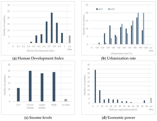 Socioeconomic statistics on the countries located in the Sunbelt. (a) Sunbelt countries’ HDI in 2020, Source: modified from [92]; (b) Sunbelt countries’ urbanization rate in 2020 and 2050, Source: modified from [22]; (c) Sunbelt countries’ income level in 2020, Source: modified from [93]; (d) Sunbelt countries’ GDP/capita in 2020 in current $, Source: modified from [94].