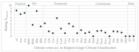 The rating labeled as XClimate with values between 0 and 10 was created using a linear approach between the climate zone with the highest CDD (XClimate = 10) and the one with the lowest (XClimate = 0). Figure 4 presents the results with XClimate per climate zone.
