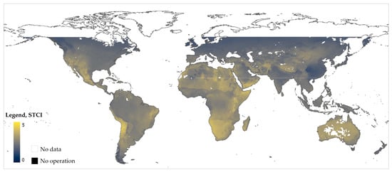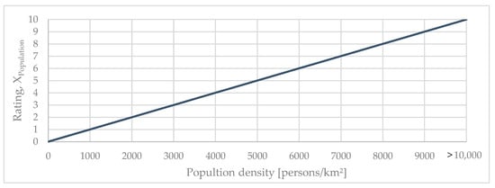Population density is applied in the CDMI using data from Wang et al. [91], accessed through the SSP Scenario Database of the International Institute for Applied Systems Analysis (IIASA) [112], with data available at a high resolution of 1 km across the globe. These data consider individual regard of demographic issues such as the development of the total population, urbanization and migration [91]. Using population data on a resolution of 1 km allows detailed outcomes for investigating the total population per climate zone in the future. The rating (XPopulation) of the population density is oriented on a maximum value of 10,000 persons/km². This value was chosen as the maximum to avoid giving disproportionate weighting to data cells with a (calculated) population density of 100,000 or higher. Cells with a population density below 10,000 persons/km² are rated as linear; see Figure 5. The linear rating of the population density takes into account a double factor for double population density. If the climate and economic conditions for two cells are the same, but the population is double in one area compared to the other, the CDMI will result in a double value. Therefore, each resident receives the same value. For the 2020 analysis, population data from SSP3 have been applied, being closest in terms of world population compared to data from the United Nations Development Program (UNDP).