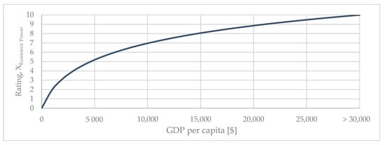 Economic power in the methodology is considered as GDP per capita, as income convergence is not part of SSP scenarios [112]. This is considered sufficient as the GDP and the income level show a vastly consistent relationship [113]. This applies in particular to low- and medium-income countries [114]. The representation of economic power, in contrast to population density, does not take into consideration a linear relationship between rating and GDP per capita. Instead, a logarithmic approach was followed (Figure 6). It is to consider, that rising economic power does not forcibly correlate with higher meeting of cooling demand. Instead, the fast-rising GDP of countries of lower income is of relevance [16]. In contrast to the two previous CDMI factors, economic power is considered only on an international level, not considering different values within a country. A low economic power in a country is represented in a low rating, so the likeliness that the people invest in space cooling is represented as low. This takes into account, that the population in countries of low economic power rather answer their base-level goods. However, the rating increases strongest for GDP/capita below 10,000 $/capita. Therefore, investing in cooling applications is significantly more likely, once the basic needs are fulfilled. In combination with a high climatic rating the acquisition is considered as a priority and the CDMI increases. Country-specific data for population are based on Samir et al. [115], country-specific data for national GDP (in 2005 $ PPP) are based on Cuaresma [23] and geographic data for GIS representation are based on Natural Earth Data [116]. Data for country-specific GDP/capita in 2020 are derived from World Bank [94]. For countries and territories without data given for 2020 (such as South Sudan, Guadeloupe or Norfolk Islands), nor for 2050 scenarios, a GDP of 1000 $/capita were used, to show at least some representation, except for Venezuela and the island of Taiwan were data from the IMF [117] were used. For countries and territories not represented by Cuaresma [23], the values of 2020 have been maintained for 2050 scenarios. Figure 6 shows the applied rating (XEconomic Power) of GDP, with a maximum rating of 30,000 $/capita (PPP 2011).