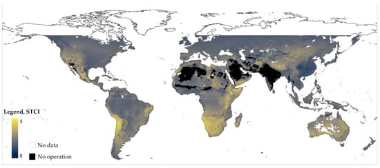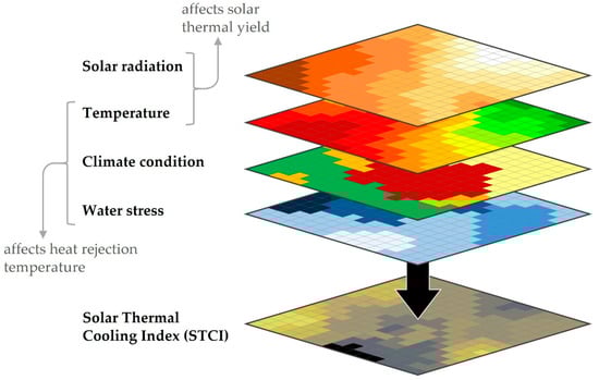 The aim of the Solar Thermal Cooling Index (STCI) is to illustrate in a simplified way how promising or limited a selected solar cooling system is at a specific point in the world. For this approach, GIS software (QGIS) was also used to create geographic maps based on environmental and climate parameters. The systems considered are solar-thermal-fired only. A short comparison of the system is provided in the following Table 3. The two absorption chillers (AbC) differ in that one uses ammonia (chemical formula: NH3) as refrigerant and water as sorption material, whereas the other uses water as the refrigerant and Lithium-Bromide (chemical formula: LiBr) as liquid sorption material.