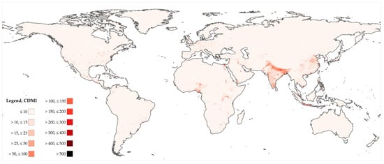 Figure 7 shows the methodology of CDMI calculation. The data information of the three parameters is stored in three raster grids. The multiplication of this information leads to the CDMI results.