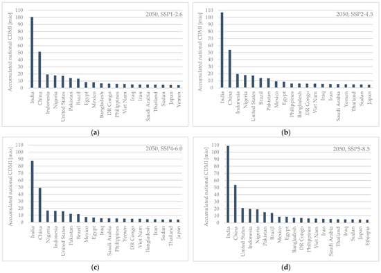 Scenarios using data from both pathways are labeled according to IPCC AR6 and the Physical Science Report as SSPX-Y, with X referring to the SSP and Y referring to the RCP model [104]. In accordance to Table 1 of [104] presenting the most suitable matches of SSPs and RCPs and considering the availability of Geoinformation Systems (GIS) data, the following four scenarios for the year 2050 have been chosen for investigation: SSP1-2.6, SSP2-4.5, SSP4-6.0 and SSP5-8.5.