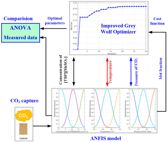 The main objective of this study is to determine the optimal set of control parameters that can maximize CO2 solubility. Because the available data points are limited, an appropriate approach is to use an AI tool, such as ANFIS, to construct a model of the system. Once the model is generated, an optimization technique can be applied to identify the optimal parameter values. In this study, the IGWO method was utilized to perform the task. Therefore, the following subsections outline the methodologies for both phases.
