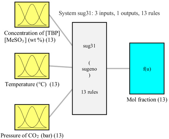 To determine the optimal ratios of MEA and [TBP][MeSO3] to enhance CO2 absorption, it is crucial to develop an accurate model. The adaptive network fuzzy inference system (ANFIS) is an artificial intelligence tool that can deduce the trend of a model from experimental input–output data. Unlike traditional mathematical tools, ANFIS uses IF-THEN fuzzy rules to represent the functionality between inputs and outputs. These rules can be generated through data modeling using a clustering approach. Using this approach, ANFIS can develop an optimal set of rules to obtain the least number of rules while maintaining model accuracy. Before submitting the inputs to the fuzzy rule to generate the output, the inputs are nonlinearly mapped from their crisp domain values to the fuzzy domain values by membership function MFs. The inference engine then generates an output for each rule, which is combined to form a final single output. ANFIS is well-suited for this task due to its high efficiency in modeling data-based systems [29,30,31].