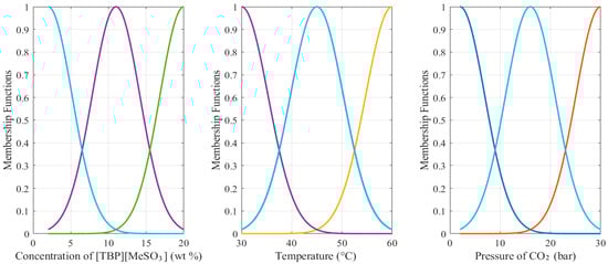 In the current study, the concentration of [TBP][MeSO3], temperature, and pressure of CO2 were used as the inputs and the mol fraction as the output. Figure 3 illustrates the structure of the three-input single-output ANFIS model, showing the inputs, outputs, and rule types. In the modeling, the ANFIS rules are selected as Sugeno-type, and the subtractive clustering algorithm generates the lowest number of rules 13. Additionally, at Gaussian shape, MF was selected for the nonlinear mapping between the crisp and ANFIS domains. Figure 4 shows the MFs for each input. The figure shows that the inputs are consistently dispersed throughout their discourse domain with uniformly spaced distances, indicating that each cluster (defined by a different colored curve) has the same impact on the outcome.