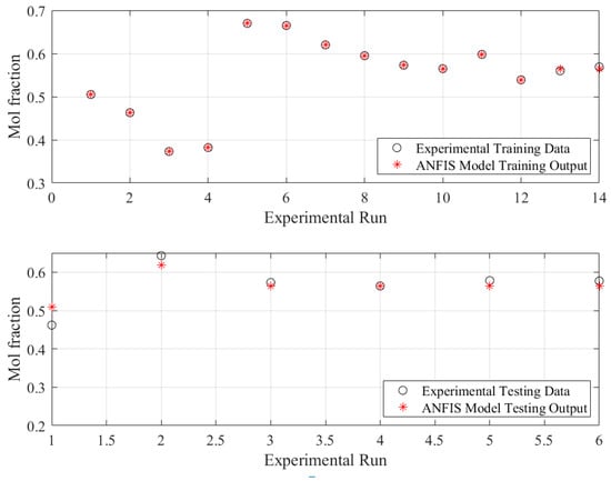 Predicted versus experimental data of ANFIS-based model of mol fraction.