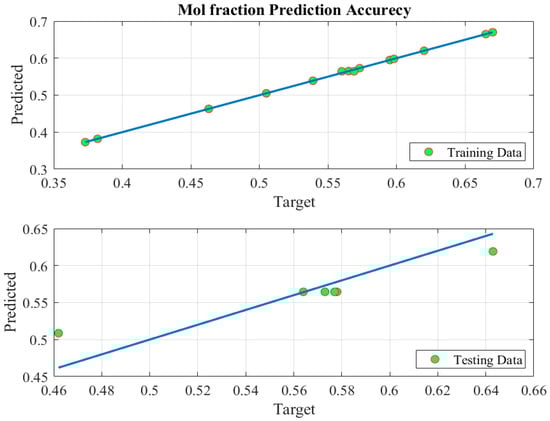 Figure 6 supports the outstanding prediction accuracy of the ANFIS model, as shown in Figure 5, by plotting the predicted data points around the 100% prediction accuracy line. This demonstration was performed for both training and testing predictions, where it shows that the model was trained with almost 100% accuracy (upper plot). To demonstrate that the model was not overtrained, the plots for the testing data points proved that the predictions (lower plot) were close to the 100% accuracy line.