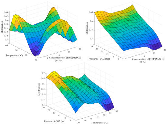 The resulting 3-D surfaces that relate the mol fraction to every 2-input combination.