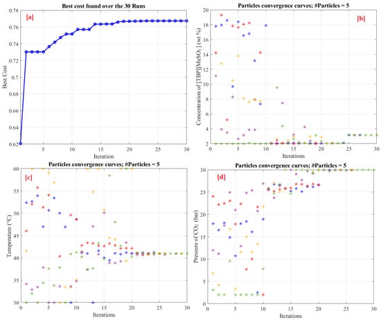Optimization results; (a) best objective function variation using IGWO, (b) particle convergence of concentration of [TBP][MeSO3], (c) particle convergence of temperature, and (d) particle convergence of pressure of CO2.