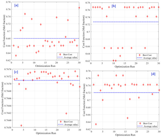 Details of 30 runs; (a) SMA, (b) PSO, (c) IGWO, and (d) HHO.