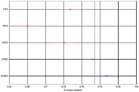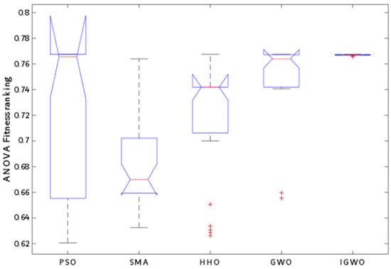 Figure 9 shows the performance of the five optimization algorithms considered in the 30-run processes. This procedure is usually performed to demonstrate the robustness of every optimizer based on the calculated average and STD values of the optimizer outputs throughout the whole run. The optimizer was considered more robust when the average value was closer to the best value. In addition, when the standard deviation is small, the results of most runs are very close to each other. As shown in Figure 9c, the IGWO produced the best (highest) average value. It is clear that the average value is really close to the optimal value. Additionally, each run yielded a result distributed close to the average value, and most of the results were above the average. These findings were obtained because of the guided convergence behavior of the proposed solutions during the search process, as shown in Figure 8. In contrast, SMA exhibited the lowest average value, as shown in Figure 9a. In addition, the SMA results were broadly scattered, most of which were lower than the average value. This conclusion supports and matches the statistical analysis illustrated in Table 4, which presents the cost function values obtained during the 30 optimization runs.