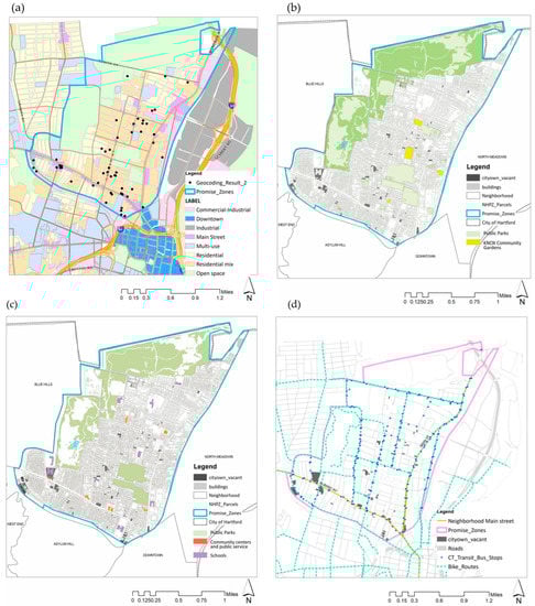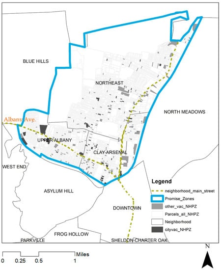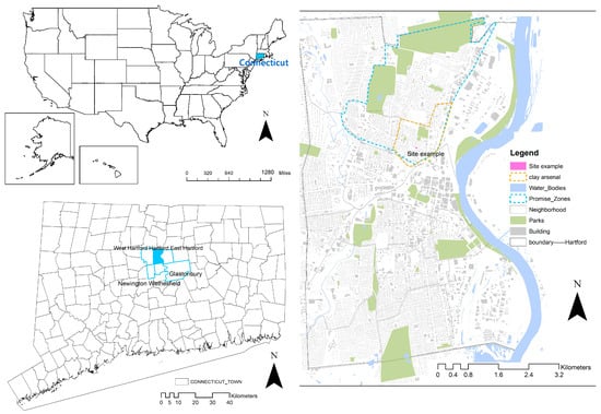 GIS-based scientific support tools have been adapted for effective decision-making in spatial planning and management for green infrastructure planning in urban areas [,]. However, such tools have not been developed and used holistically in the context of vacant land assessment and management. In this regard, this study focuses on the establishment of a decision support tool for assessing and characterizing vacant lots in legacy cities during the spatial planning process. Consequently, the GIS-based Vacant Lots Assessment System (VLAS) was developed for integrated assessment of vacant lots, their distribution, and contextual characteristics, for use in urban renewal and greenspace planning. The capability and workflow of this system were demonstrated in the case study area—the North Hartford Promise Zone in Hartford, Connecticut, USA—at the district and neighborhood scale (Figure 1). And one site scale vacant lot greening design example was also provided, to demonstrate the application and use of VLAS to inform vacant lot site designs. In doing so, three research questions of this study were addressed as follows: