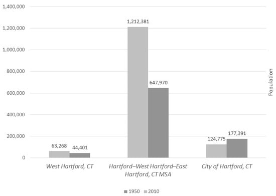 Population changes in the City of Hartford, Hartford metropolitan region, and suburban town of West Hartford from 1950 to 2010. Data source: 1950 and 2010 Census.