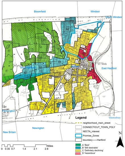 We use North Hartford Promise Zone as a case study to develop, refine and demonstrate the GIS-Based VLAS in evaluating, assessing, and repurposing vacant lots in legacy cities (Figure 1). Hartford is the capital city of the State of Connecticut and has a rich history dating back to the early 1600s when the Dutch settled along the Connecticut River. By 1790, it has become one of the 10 largest cities in the early nation []. With the Colt Firearm Factory and other iconic early industries, Hartford became a core area of industrialization in the Connecticut River valley region after the American Civil War and was the richest city in the country at that time. However, like other post-industrial cities, deindustrialization, population loss, and vacancy issues have seriously impacted the city’s development and public welfare. Currently, Hartford is one of the poorest cities in the country, with almost 30% of the population living below the poverty line, according to the 2012–2016 American Community Survey []. The decline in industry, which started in the 1950s, has also brought about a dramatic change in the city’s racial demographics. While Hartford had attracted immigrants in the early 1900s due to manufacturing job opportunities during the booming industrial era, the declining manufacturing industry in the 1970s led to white flight and redlining, causing white and middle-class individuals who were still offered jobs by the remaining, yet thriving insurance industry in Hartford, to move to wealthy suburban areas such as West Hartford, Wethersfield, and Glastonbury (Figure 2) []. Figure 3 illustrates the historical redlining map of Hartford once rating the credit risk and racial composition of neighborhoods, where the current Promise Zone was classified as having ‘definitely declining’ (C) and ‘hazardous’ (D) grades. These grades were associated with the presence of an ‘undesirable population and infiltration of it’ leading lenders to not or conservatively make loans in this area [].