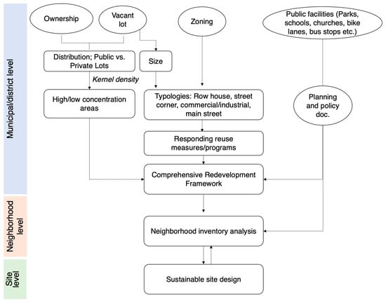 The study presents a multi-scale GIS-Based Vacant Land Assessment System (VLAS) designed to inform vacant land transformation alternatives at the district, neighborhood, and site scales (see Figure 5). The VLAS focuses on district scale by assessing the distribution and associated resources of city-owned vacant land in NHPZ, leveraging publicly accessible GIS data and U.S. Census data (See Section 2.2.1 for details). This phrase evaluates the variation in size, location, previous land use, physical condition, and neighborhood contexts []. Additionally, planning regulations and documents at the municipal, county, regional, and state scales were reviewed, including the Municipal Plan of Conservation and Development (a ten-year strategic plan from the municipality), Downtown Redevelopment Plan, Regional Pedestrian and Bicycle Plan, and municipal sustainability documents. This step helps identify opportunities and constraints in the area and propose a vision plan for the Promise Zone to manage and reclaim vacant lands in North Hartford, ultimately achieving the neighborhood revitalization goal for the whole city (See Section 2.2.2). Secondly, a site-scale design example is proposed based on identified sustainable goals and neighborhood scale analysis, as a protocol for sustainable greening and placemaking (See Section 2.3).