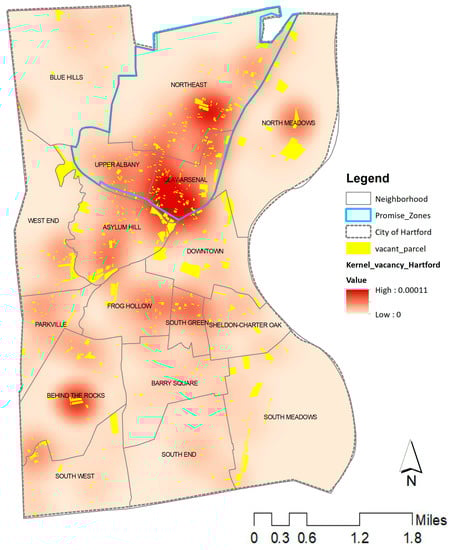 Figure 6 shows the spatial distribution of city-owned vacant lots, along with additional private vacant properties. In 2018, there were a total of 53 city-owned vacant lots in the North Hartford Promise Zone (NHPZ), comprising approximately 24 acres of land. Of the approximately 78 acres of vacant land in NHPZ, about one-third of them were owned by the city. There were 10.54 vacant lots per 1000 inhabitants in NHPZ, compared to figures in other post-industrial cities with similar population density, such as Detroit, MI (9.74), New Haven, CT (4.26) and Worcester, MA (0.29) []. These facts highlight the urgent need to address the issue of urban vacancy in NHPZ. According to the Kernel density analysis, NHPZ, and especially the Clay-Arsenal neighborhood, is the epicenter of urban vacancy agglomeration spots, compared to other parts of the city (Figure 7). Many vacant lots in NHPZ are concentrated in the Albany Avenue area, which is the main commercial street of the zone’s two southern neighborhoods, Clay Arsenal and Upper Albany (Figure 6).