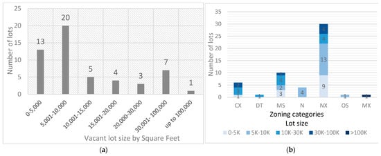 (a) Histogram of city-owned vacant lots by area (Square feet); (b) Number of city-owned vacant lots by parcel size and zoning type. CX = Commercial-Industrial Mix; DT = Downtown; MS = Main Street; N = Residential; NX = Residential mix; OS = Open space; MX = Multi-Use Mix.