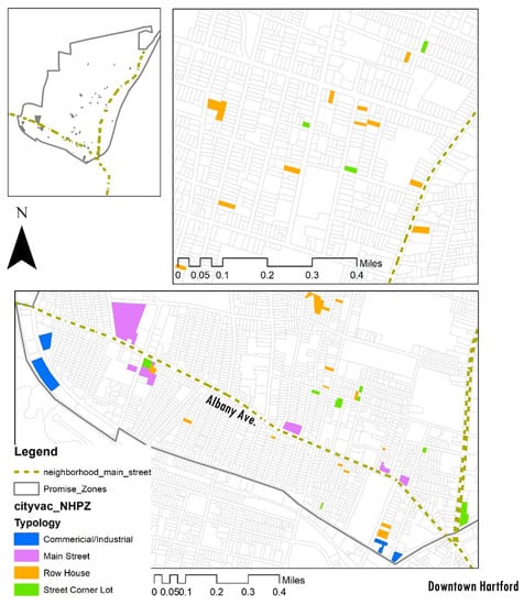 Row houses are characterized by small and narrow lots located in the middle of residential blocks (Figure 10). Typically, these lots are zoned as neighborhood residential, and their surrounding lots are also small-scale residential houses. Given the shortage of affordable housing in Hartford NHPZ, row houses were proposed as infill developments to restock the housing supply and residential neighborhoods in vacant lots. In addition to the traditional economic benefits such as increasing tax revenue, infill development for row houses can also improve the aesthetics of the neighborhood, increase population density, and promote the efficiency of public infrastructure [,]. Transforming this type of vacant land into housing units through an infill program can also diversify the demographics and the housing types of these neighborhoods, helping to mitigate social segregation, while increasing the percentage of owner-occupied homes. This, in turn, can help the city combat blight and vacancy issues in this area [].