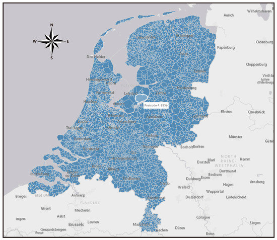 The data employed in this study were retrieved from different data sources. In particular, being the most critical dependent variables, the activity duration was collected as part of the Dutch national travel survey conducted from January to December 2020 [62]. The survey includes data from 62,940 respondents, about 0.38% of the population aged six years and older. Respondents were asked to keep a record of where they visited, for what purpose, with what means of transport, and how long the activity lasted for one particular day of the year. Additionally, information of individual/household characteristics, such as age, gender, and driving license, was also collected. The location data were registered at the 4-digit postcode level, which was used to link with the data at the neighborhood level. The data contained a total of 4072 4-digit postcode areas (see Figure 1).