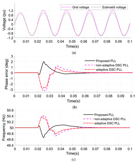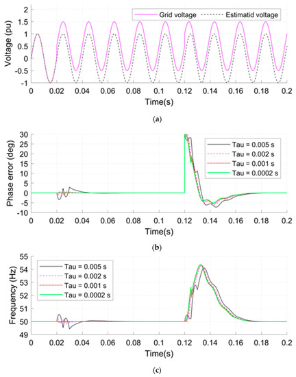 - A jump in the amplitude of the grid voltage from 1 to 1.1 Pu and a DC-offset with a value 0.2 Pu applied at 0.02 s (see Figure 12a).