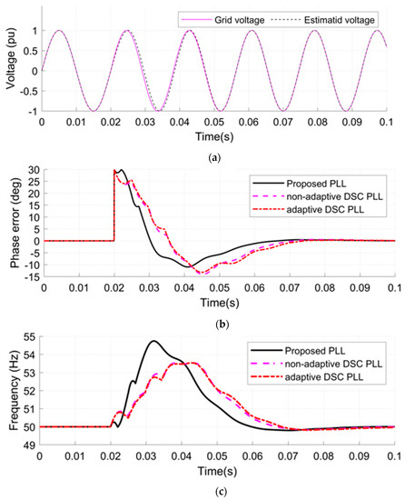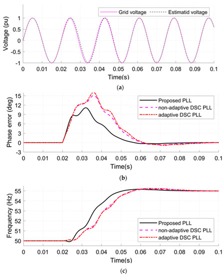 - A jump in the grid frequency is applied from 50 to 55 Hz at 0.02 s (see Figure 8a).