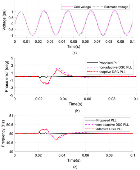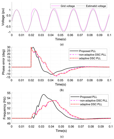 - A DC-offset is applied at 0.02 s to the grid voltage with a value of 0.1 pu (see Figure 9a).