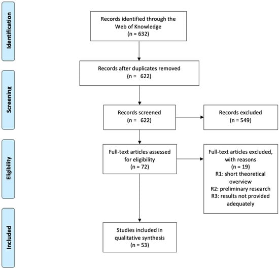 The research field was limited to “engineering, industrial”, “engineering, manufacturing”, and “engineering, multidisciplinary” in order to gain more accurate results related to logistics processes of the manufacturing industry. As shown in Figure 1, a total of 632 abstracts were browsed, with 10 duplicates excluded. After the screening process, 72 full texts were available and assessed for eligibility, with 19 of them excluded due to insufficient data provided both in terms of theoretical background or research result. Therefore, 53 papers were examined in detail for the purposes of this research.