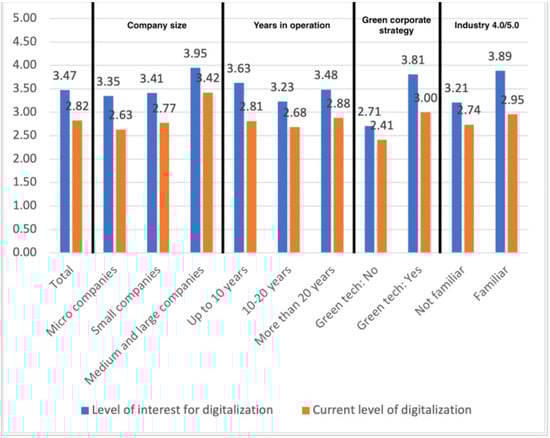 The participants were asked to approximate the level of interest of their company in digitalization and the current level of digitalization. The results are shown in Figure 3.